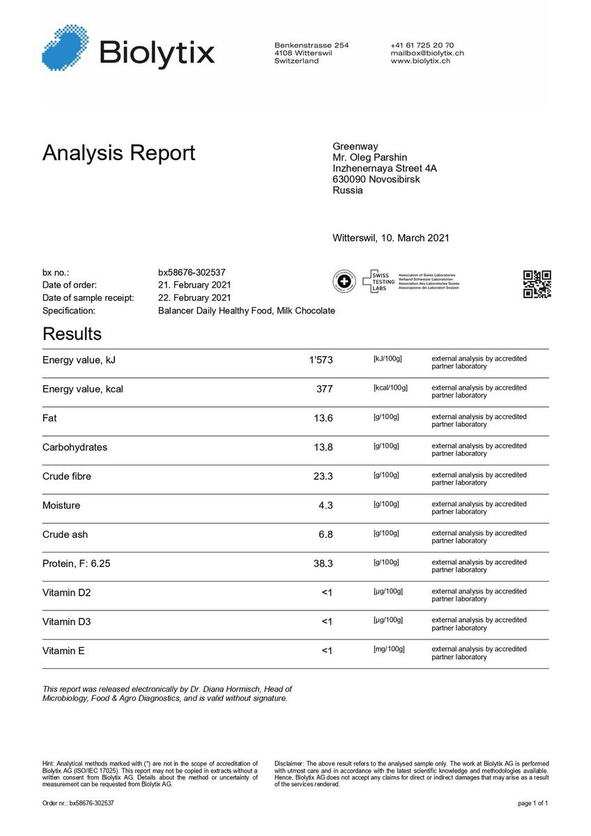 СПЕЦИАЛИЗИРОВАННЫЙ ПРОДУКТ ДИЕТИЧЕСКОГО ПРОФИЛАКТИЧЕСКОГО ПИТАНИЯ BALANCER СО ВКУСОМ «МОЛОЧНЫЙ ШОКОЛАД»